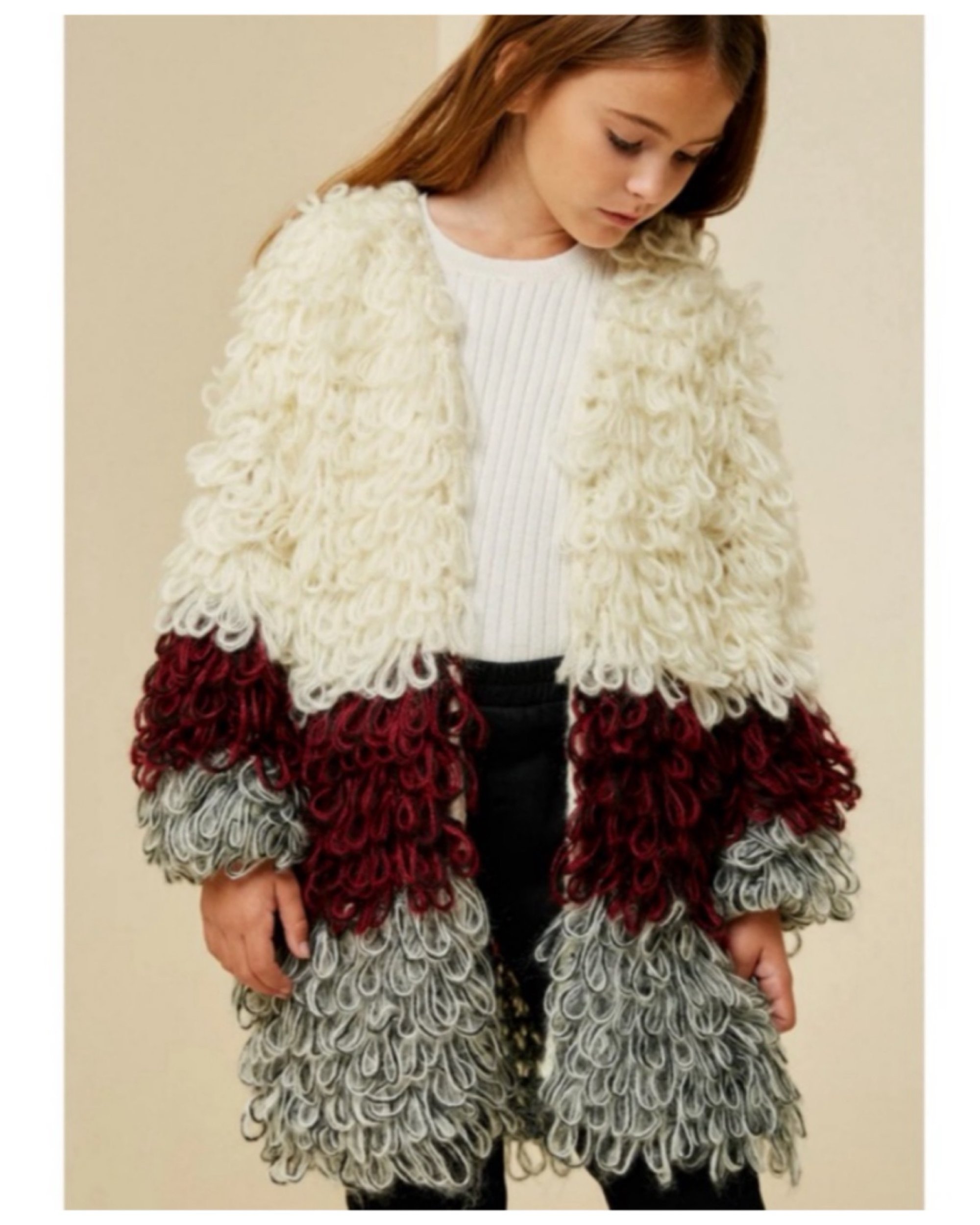 Our Berry Cloud Cardigan wraps her in warmth with a dreamy blend of white, burgundy, and gray tones, like a cozy hug on a chilly day. Designed with long sleeves, soft knit texture, and a comfy open fit, it's perfect for layering over dresses, tees, or her favorite jeans.
